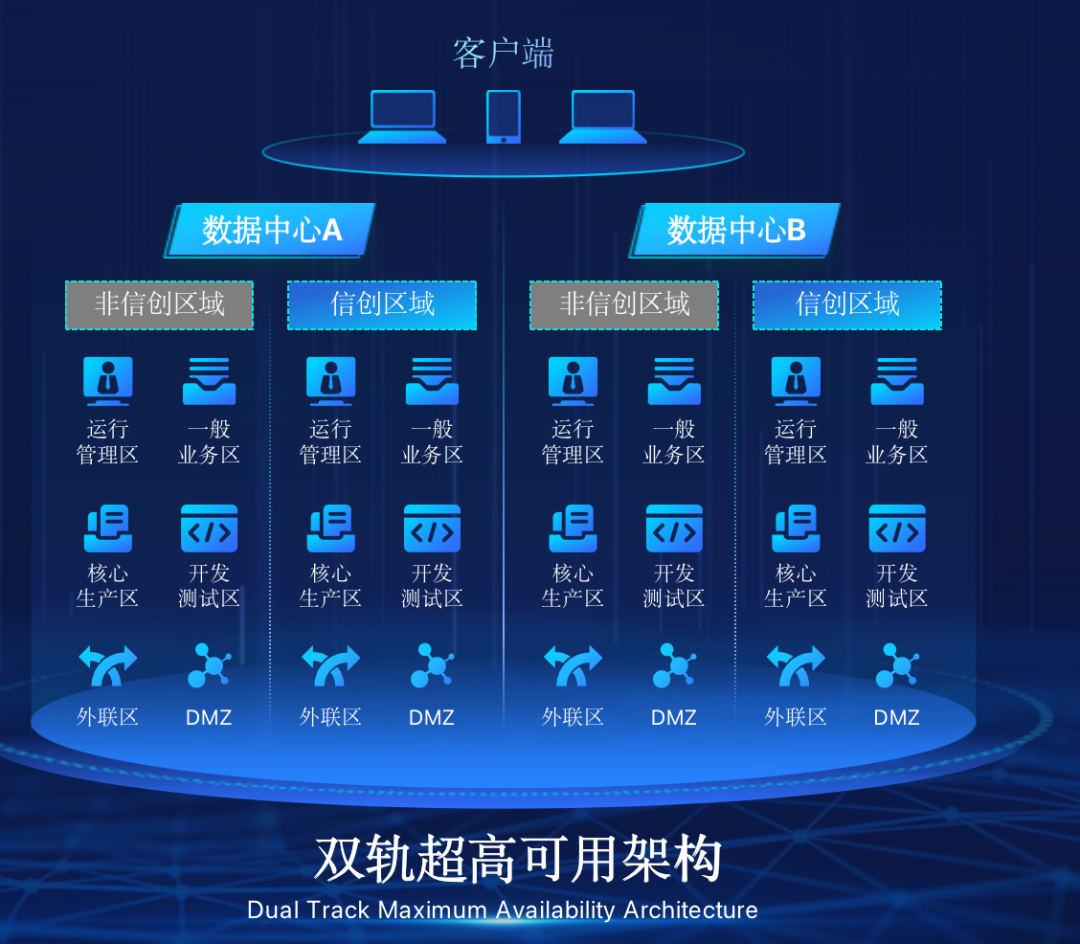 K8凯发(中国)在企业面临自主创新IT基础重构过程中,推出的全新架构双轨超高可用架构(简称DTMAA),在双活数据中心的分区调度基础上,添加每个数据中心内信创域和非信创域的分域调度,来实现分区分域协同的多活双轨超高可用。