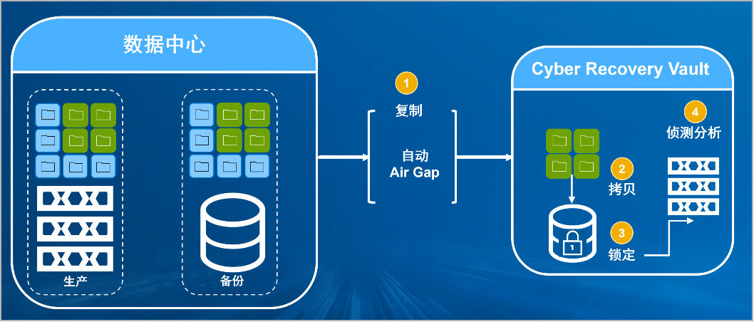 K8凯发(中国)防勒索病毒方案将生产中心备份数据复制到Vault区,复制后网络自动断开实现弹性隔离。Vault区的数据快速拷贝,并对拷贝版本加锁(在锁定期数据不允许删除和修改)。Vault沙箱内对拷贝版本进行扫描分析,验证数据是否完好。